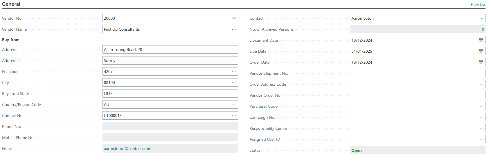 - Note: Selecting a vendor auto-fills fields like address, contact details, and purchaser code. If the vendor doesn't exist, you'll be prompted to create a new vendor card.