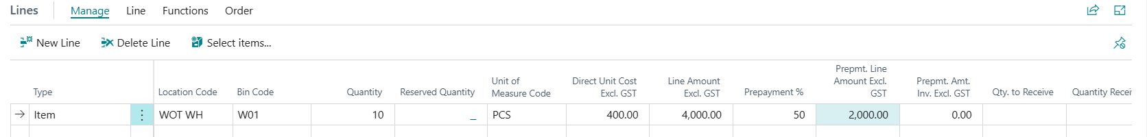 Note: The Prepmt. Line Amount Excl. GST field gets updated as a prepayment percentage off the Line Amount Excl. GST field.