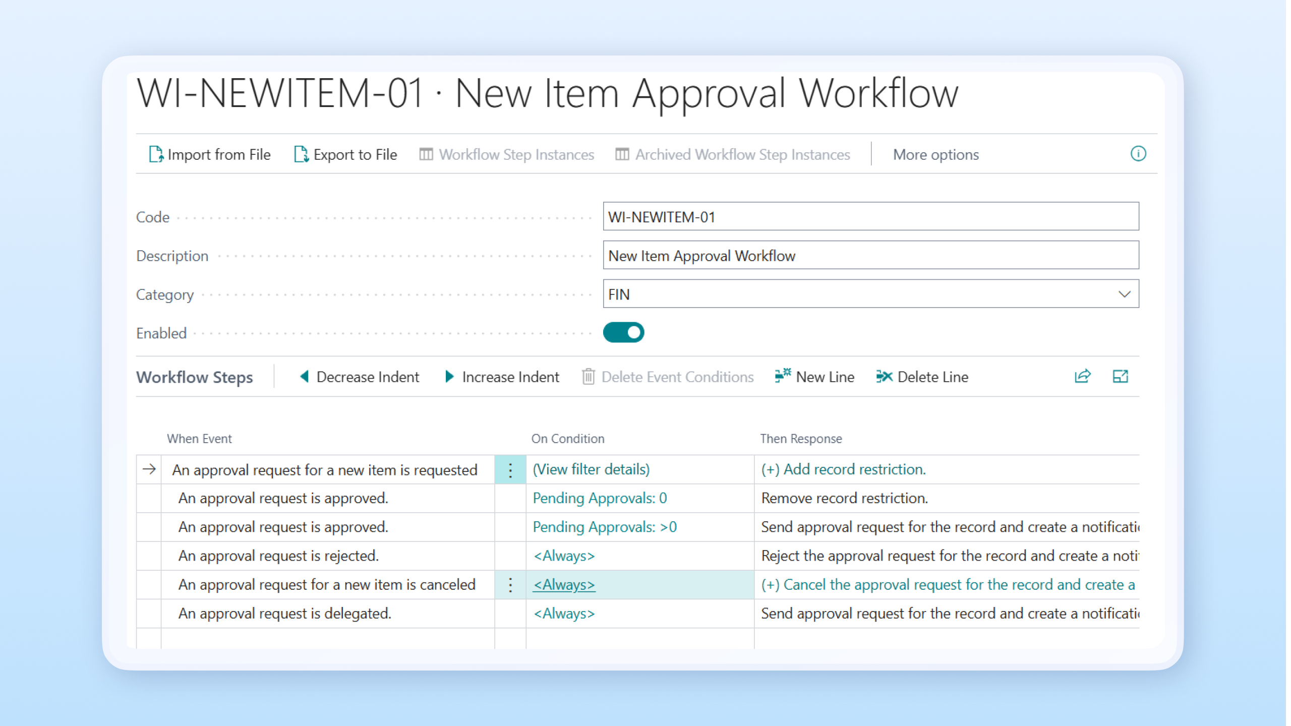 Until approved, the item cannot be used in sales orders, purchase orders, inventory journals, or planning worksheets. Approvers can approve, reject, or delegate requests, and all actions are tracked in the audit history.