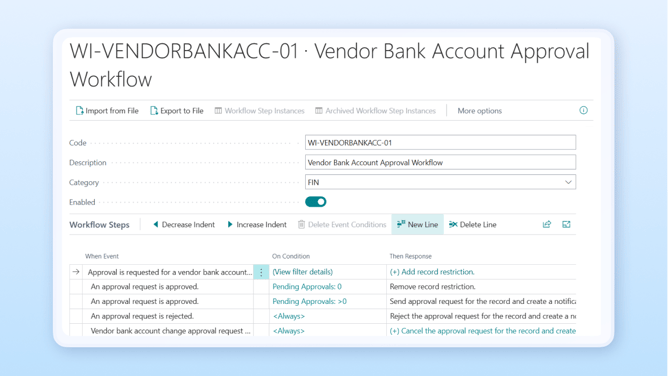 With this update, vendor bank account changes can now require formal approval before they can be used in payments. When a change is submitted and meets configured conditions, the account is set to Pending Approval and cannot be selected in payment journals until approved.