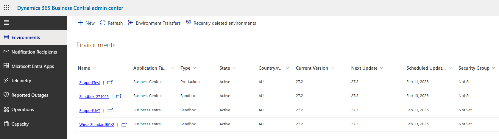 Note: If your access to the Wiise environment is restricted, someone in your organisation with access to the admin center, with at least a Dynamics 365 Administrator or a Dynamics 365 Business Central Administrator, must manually install Wiise updates. This ensures you can take advantage of new features, bug fixes, and improvements.