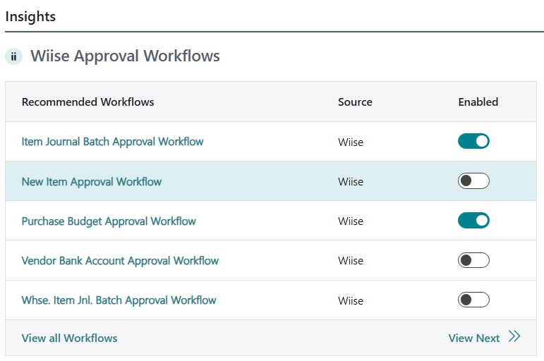 - You can now see that the New Item Approval Workflow toggle Enabled on the Wiise Approval Workflow widget in the Insights panel.