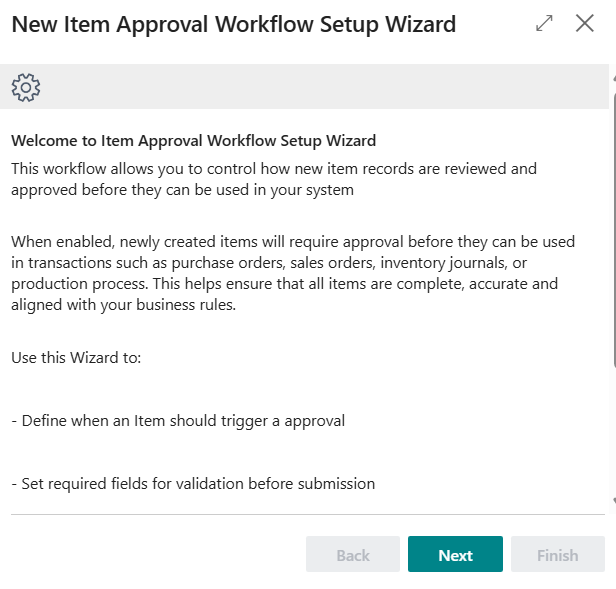 Here are the steps to launch the setup wizard and set up approval workflows for new items: