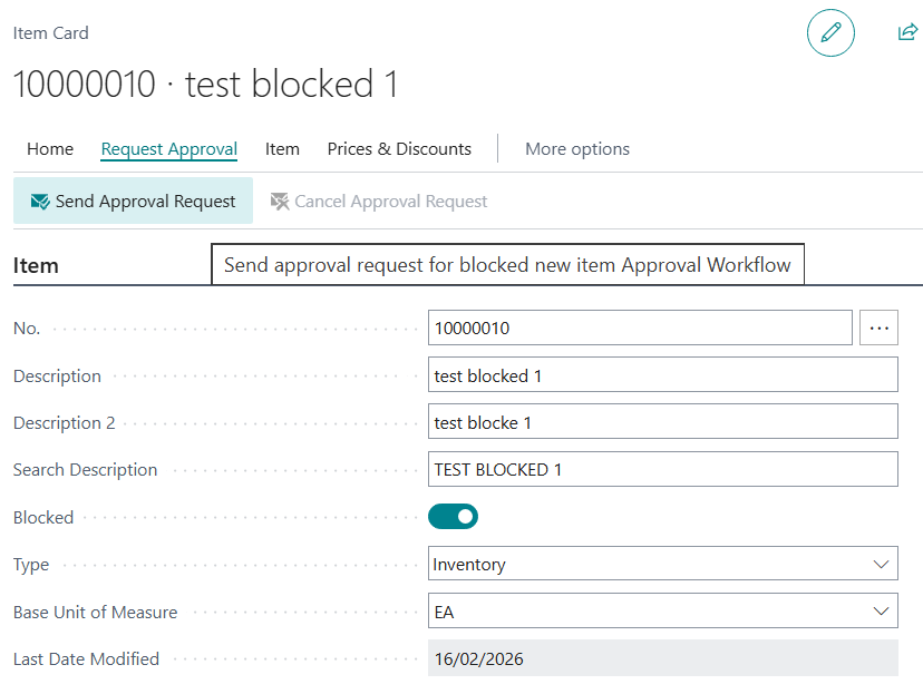 Note: Once the New Item Approval Workflow is Enabled and an approval request is sent, the item remains Blocked until a decision is made.