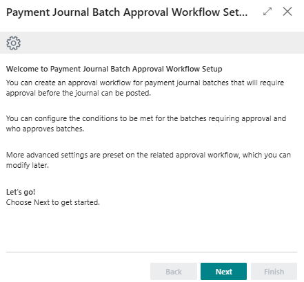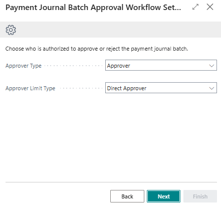 - The Payment Journal Batch Approval Workflow Setup Wizard page displays.