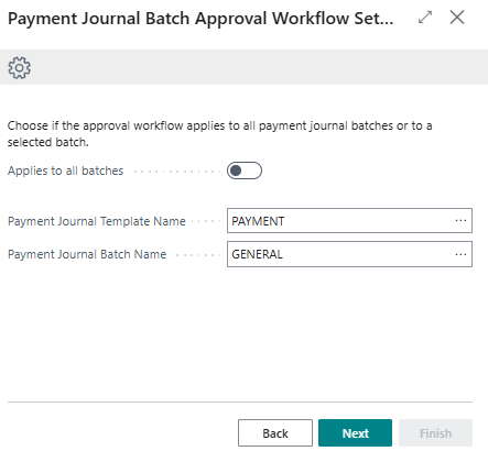 - Applies to all batches: Enable the toggle when your approval workflow applies to all payment journal batches.