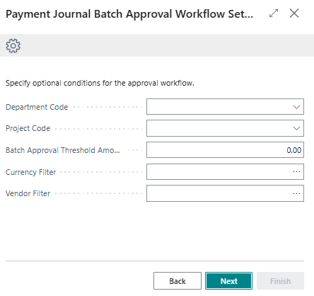 Note: You can specify optional conditions such as dimensions, filters and batch approval threshold amounts on your payment journal batch approval workflow. - Select Next to continue.