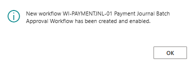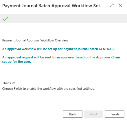 - The next page confirms that your Payment Journal Batch Approval Workflow will be set up based on the requirements you’ve updated in the setup page.