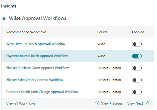 Note: You can now see that the Payment Journal Batch Approval Workflow toggle is Enabled on the Wiise Approval Workflow widget in the Insights panel.