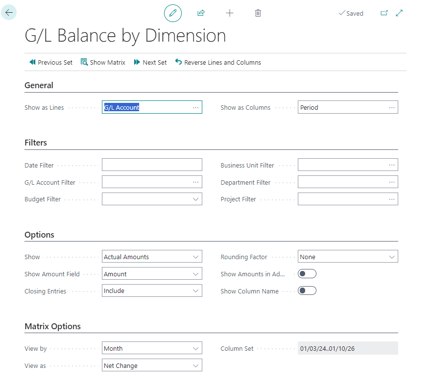 - The G/L Balance by Dim. Matrix report displays the account balances segmented by the selected dimension values.