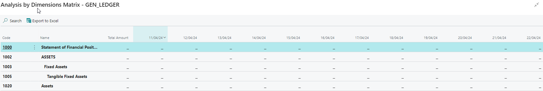 - The Analysis by Dimensions Matrix is generated based on the requirements where the G/L account Show as Lines and Period Show as Columns.