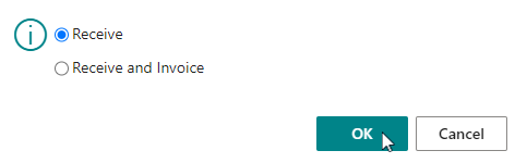 Note: You can select the Autofill Qty. To Handle if the Qty. To Handle field matches the Quantity field. - Select Post. A message box displays to confirm if you want to Receive or Receive and Invoice.