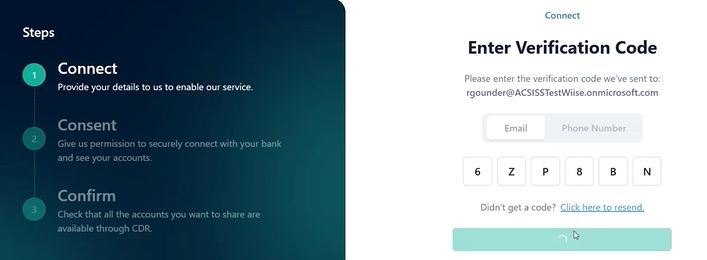 Note: The Connect page requires you to provide your details to enable the CDR Ready service. - A six-digit verification code is sent to your email or phone number.