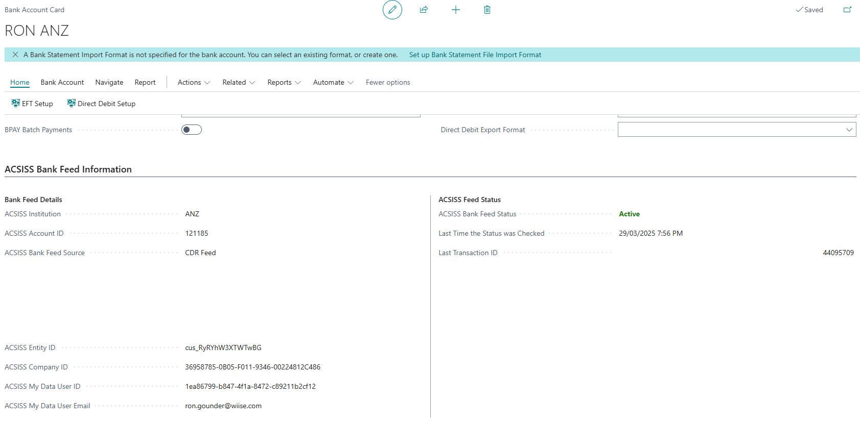 Note: On your active bank account card, select the ACSISS Bank Feed Information section. The fifth section only appears after you’ve connected to a bank feed. Here, you can view your bank feed details and check ACSISS Feed Status to confirm the connection is active.