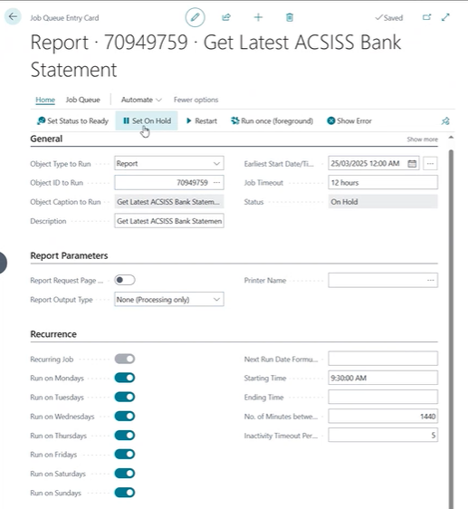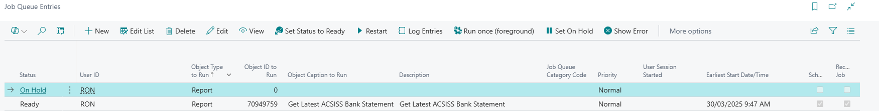 - Select + New to set up the job queue entry to run your ACSISS bank feeds.