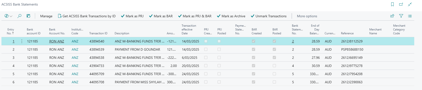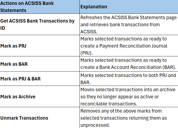 Note: There are 6 buttons on the ACSISS Bank Statements list. There’s no need to manually mark transactions as PRJ or BAR as they are applied automatically from the bank feed.