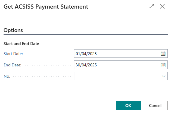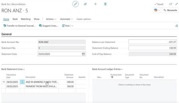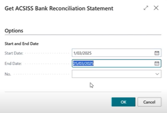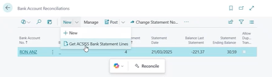 Tip: You can perform reconciliations using Microsoft Co-pilot if enabled. - Select New. Then, select Get ACSISS Bank Statement Lines.
