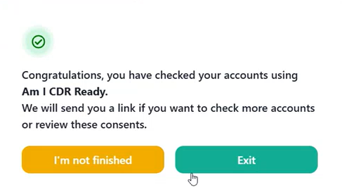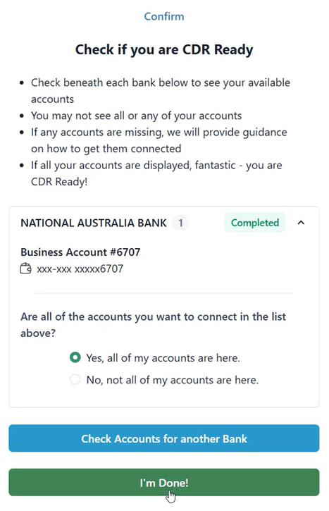 - A message box displays that you’ve checked your accounts using the CDR Ready portal.