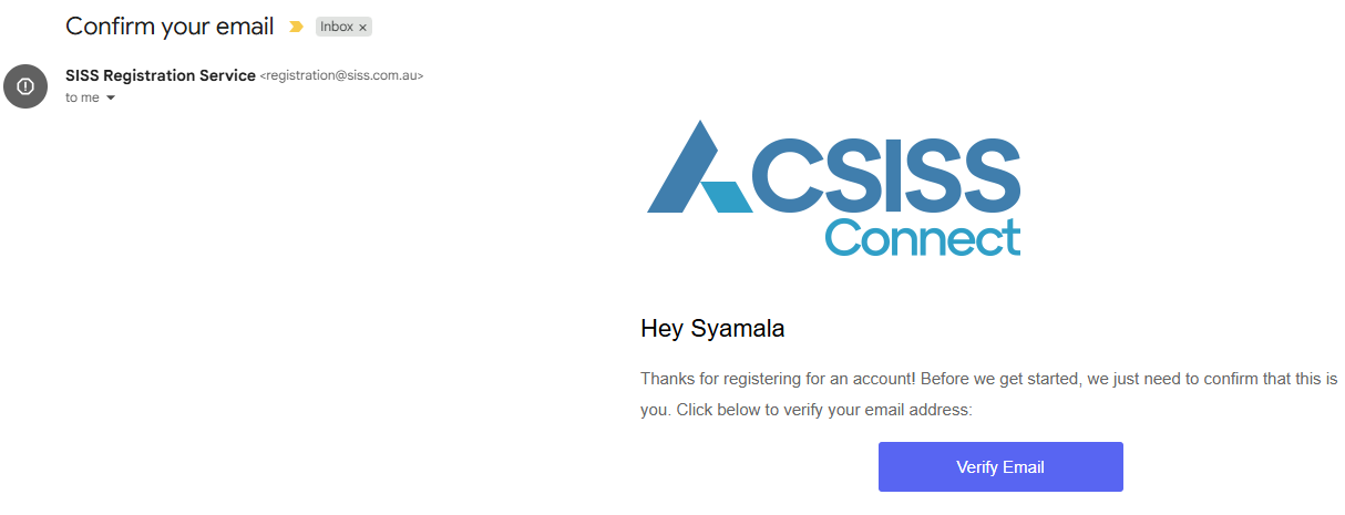- Login with your credentials. You will be requested to check your email to confirm your account. Select the email from SISS Registration Service in your email inbox. Then, select Verify Email.