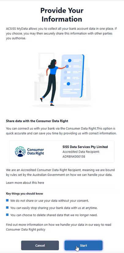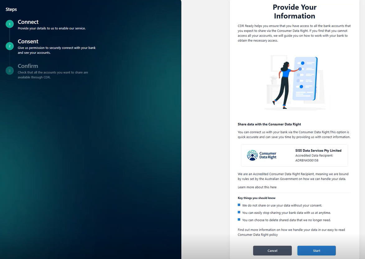Note: The Consent page requires you to give CDR Ready by SISS Data Services permission to securely connect with your bank and see your accounts. Read the information provided. - Select Start to consent.