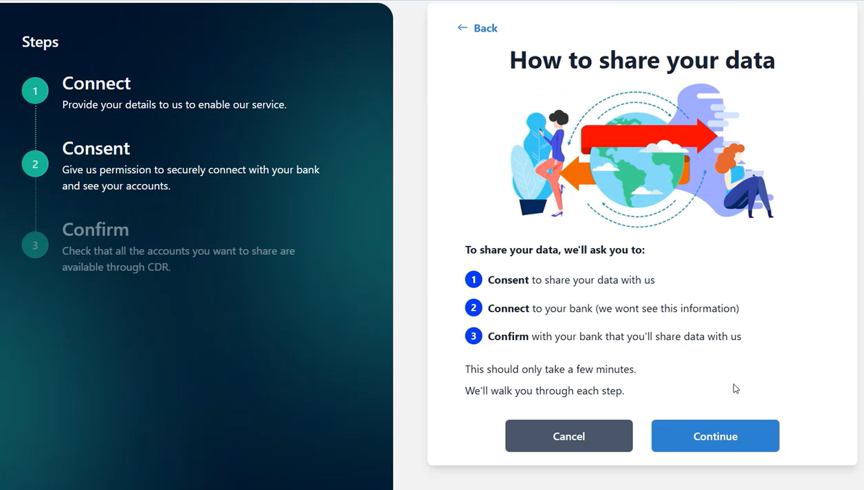 - Once you initiate the process, there are three steps you’ll need to complete. These are Connect, Consent and Confirm.