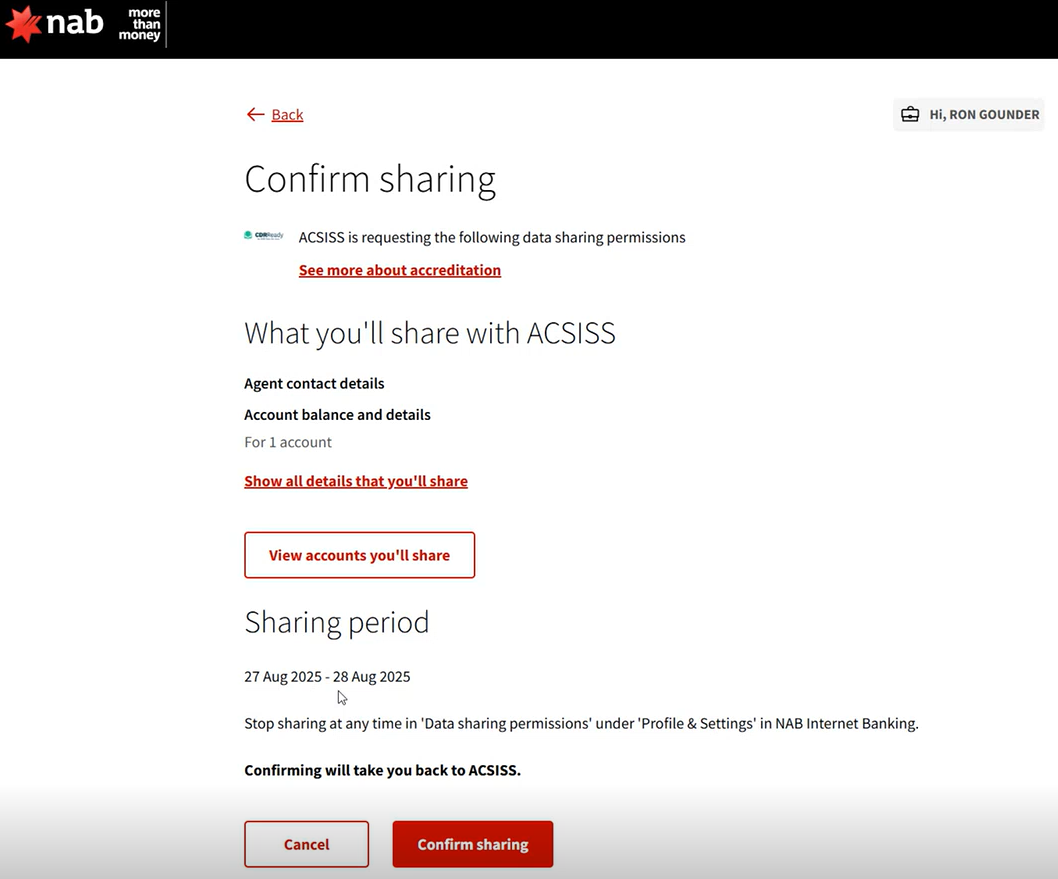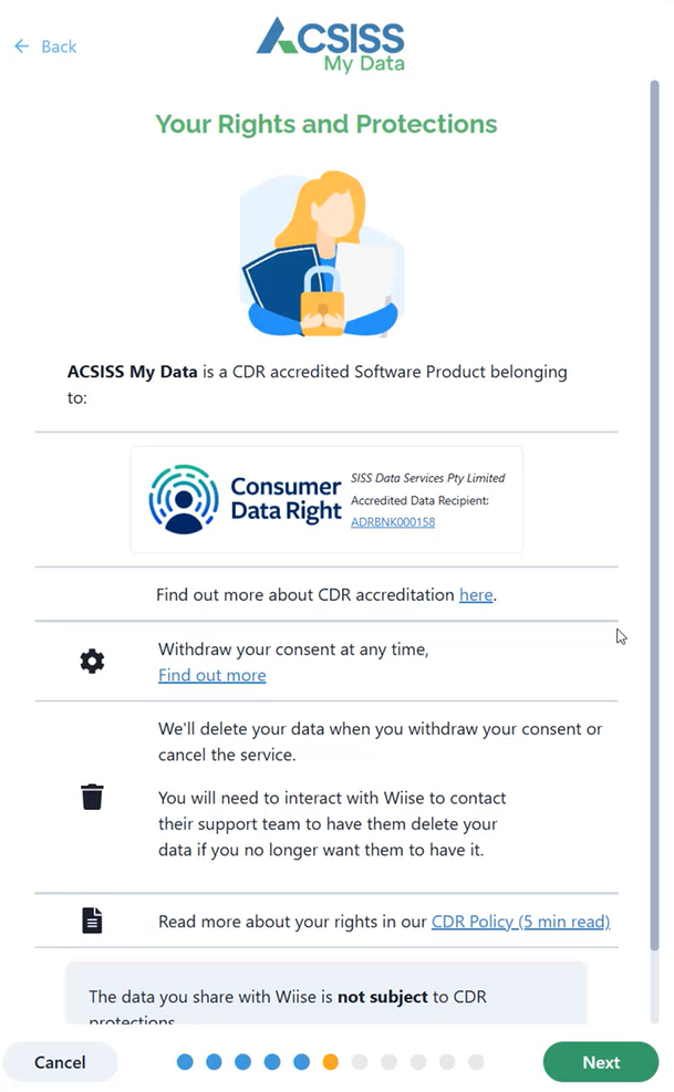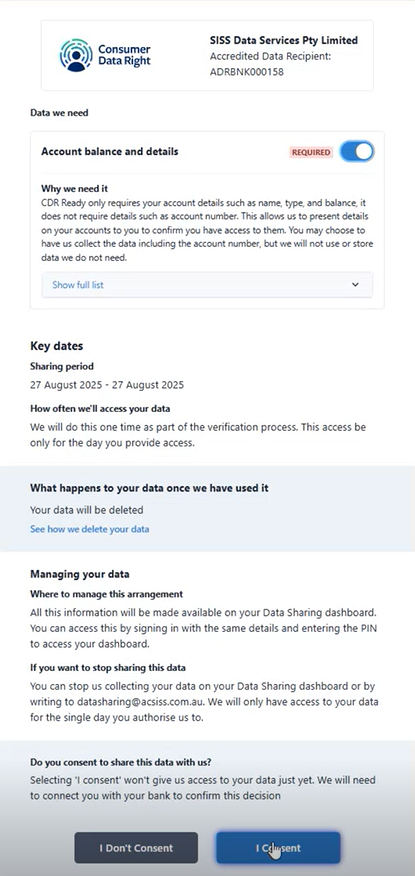 Note: Find out more on how to withdraw your consent at any time and read about your rights in the CDR Policy. - Select Next to continue.