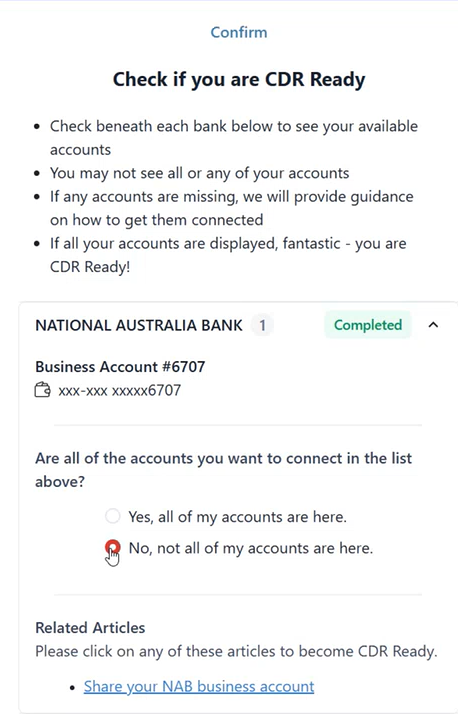 Note: Related Articles link display. Read through the instructions provided for your bank account to become CDR Ready. - When you see all your bank accounts displayed, select the option Yes, all of my accounts are here.