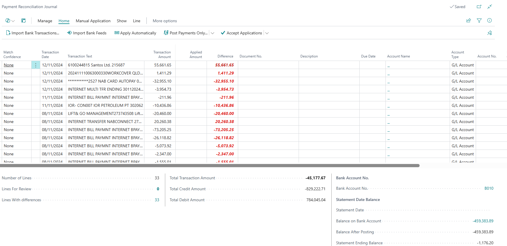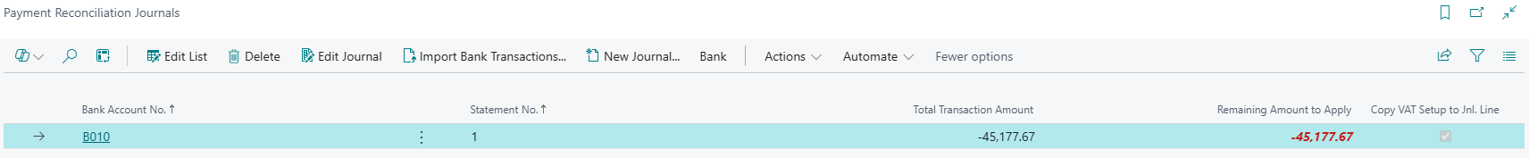 - Select the relevant Bank Account No. The Payment Reconciliation Journal page for the bank account displays.