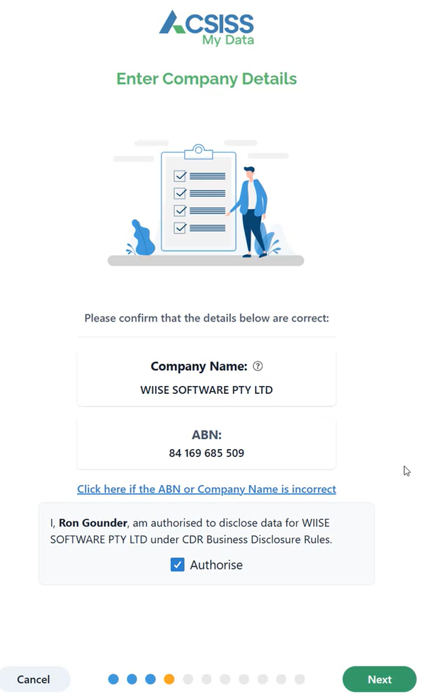 Note: Your business details are generated. As you’re signing up for CDR, you’ll need to select the Authorise checkbox to confirm that you’re disclosing data and that you have the authority to do so on behalf of your business. - Select the Authorise checkbox to confirm the declaration.