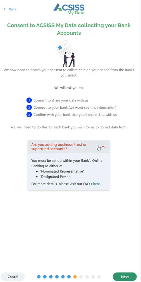 - The Consent to ACSISS My Data collecting your Bank Accounts page displays.