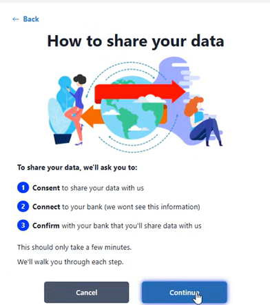 Note: To share your data, you’ll need to give consent, connect your bank account, and confirm which bank to share from. - Select Continue.
