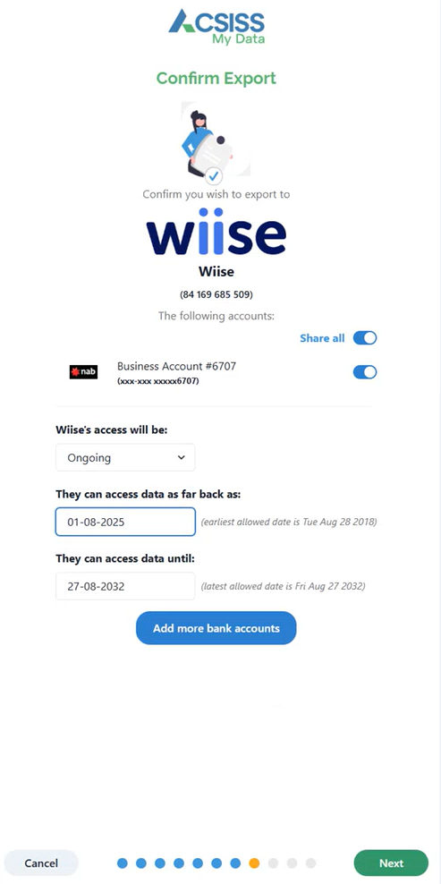 Note: Once you’ve selected your bank, you’ll be redirected to your banking portal. Make sure you have your bank login details ready. Complete the data-sharing process in your bank account by selecting the account you want to connect to ACSISS My Data. - The Confirm Export page displays. You can add and confirm which bank account you want to connect with ACSISS My Data.