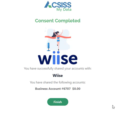Note: You’ve provided consent to share your data with ACSISS Bank Feeds and you’ve connected your new bank account to ACSISS Bank Feeds.