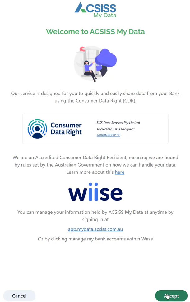 - Select the unique Wiise ACSISS link here to register your account and enable bank feeds.