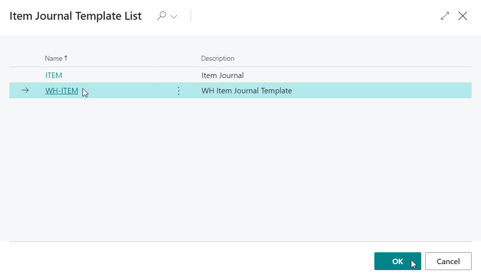 Note: If you are using warehousing features, you’d need to select the WH-ITEM item journal template.- The Item Journal batch page displays. Select your Item Journal Batch name.