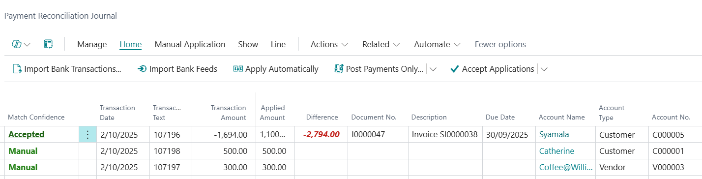 Note: When a match is found, the Applied Amount, Document No., Description, Due Date, Account Name, Account Type and Account No. Fields are updated.