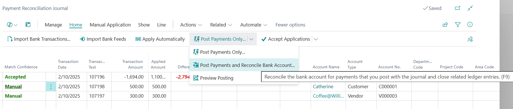 Note: Once posted, payments are recorded with the relevant customer or vendor, and the bank account is reconciled up to the statement date. You can review posted reconciliations in Posted Payment Reconciliations. If you've made an error, you can review applied entries and reverse the payment reconciliation journal.