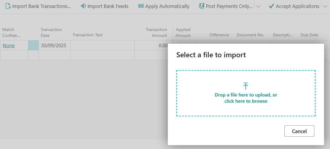 Note: The Import bank transactions function automatically matches bank transactions to open Customer or Vendor entries. If no match is found, you can manually assign the line. Use Customer for incoming payments such as direct credits against customer invoices, and Vendor for outgoing payments such as EFT or direct debit against vendor bills. If the transaction isn’t linked to a customer or vendor, use a G/L account to post it directly to the general ledger, for example, for bank fees, interest, or adjustments.