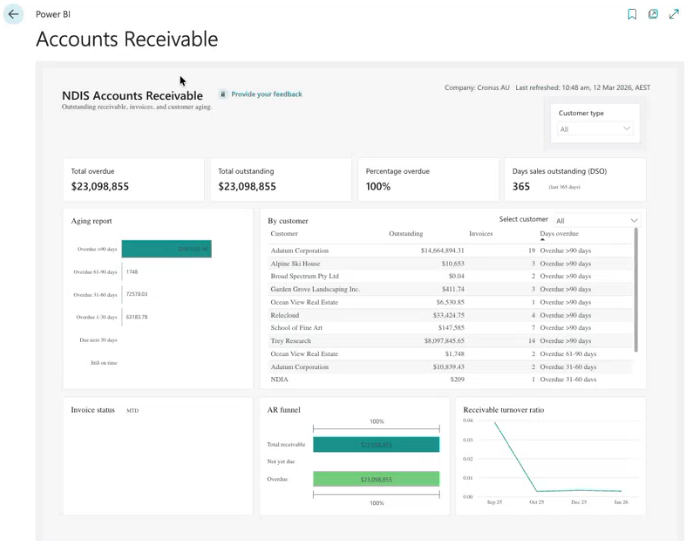 Select the Accounts Receivable menu. The Accounts Receivable Power BI reports display.