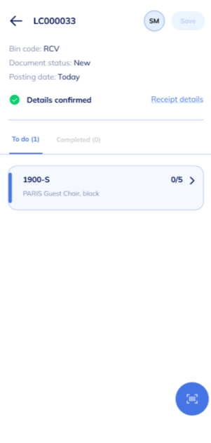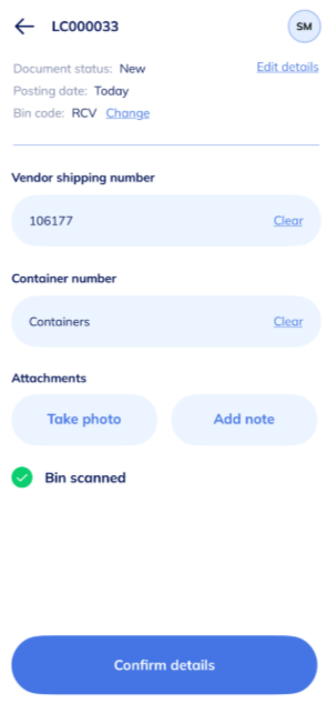 Note: The camera captures the scanned details and updates your receive bin. - Fill in the following fields: