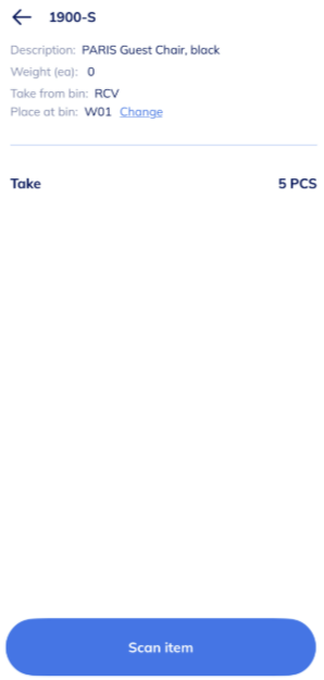 Note: If OnTime does not prompt for the Place step after a Take from the receiving bin, the system may be configured to automatically place items into the destination bin. This setting speeds up processing but removes the manual confirmation step. To change this, check your Wiise Warehouse OnTime configuration in Wiise ERP.
