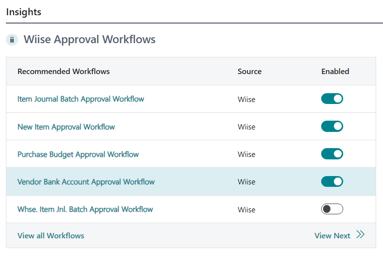 The widget displays up to 5 workflows at a time, and shows each workflow that you can select, displays the Source as either Wiise or Business Central and includes a toggle to enable or disable each workflow.