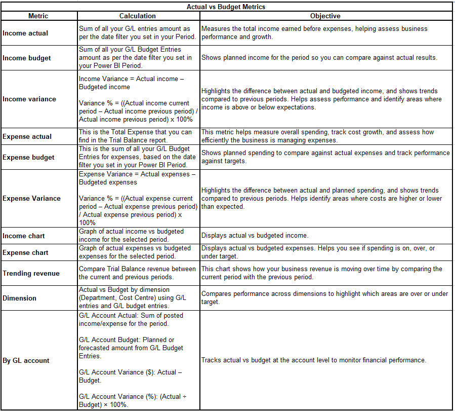- Here’s how to read and understand the tiles on the Actual vs Budget report metrics:
