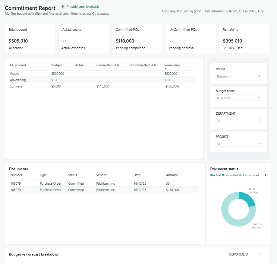 Commitment Report Metric Calculation Objective Total budget Sum of GL Budget Entry Amount for expense accounts in the selected budget and date range. Show the total planned spend for operating expenses so finance can compare against all commitments and actuals. Actual spent Sum of General Ledger Entry Amount for expense accounts in the selected date range. Show what has already been spent so users see how much of the budget has been consumed. Committed POs Sum of Purchase Line Amount Including VAT where Type = G/L Account and Document Type = Order or Invoice. Show spend that is contractually committed on purchase orders and invoices but may not yet be posted to the general ledger. Uncommitted POs Sum of Purchase Line Amount Including VAT where Type = G/L Account and Document Type = Quote. Show potential or requested spend that is not yet committed, so approvers can see what is in the pipeline. Remaining Remaining = Total Budget minus Actual Spent minus Committed POs minus Uncommitted POs. Show how much budget is still available after considering actual, committed and uncommitted spend. GL account breakdown Budget by GL account Sum of GL Budget Entry Amount grouped by G L Account No. Show budgeted spend per account so users can drill into where budget is allocated. Actual by GL account Sum of General Ledger Entry Amount grouped by G L Account No. Show actual spend per account for detailed variance analysis. Committed by GL account Sum of Purchase Line Amount Including VAT for Orders and Invoices grouped by G L Account No. Show committed purchase orders and invoices per account. Uncommitted by GL account Sum of Purchase Line Amount Including VAT for Quotes grouped by G L Account No. Show unapproved or draft spend requests per account. Remaining by GL account Remaining = Budget minus Actual minus Committed minus Uncommitted for each account. Highlight which accounts are overspending or underspending against their budget. Documents list and status Documents For each distinct Document No from Purchase Lines and General Ledger Entries, show Number, Type, Status and Amount. Provide a single place to review all spend related documents that make up the commitments and actuals. Document status breakdown Status % = Number of documents in a given status (Actual, Committed, Uncommitted, Remaining) divided by total number of documents multiplied by one hundred. Show the mix of spend that is actual, committed or still uncommitted to support approval and planning decisions. Budget vs commitments by dimension Metric Calculation Objective Budget by dimension Sum of GL Budget Entry Amount grouped by selected dimension value (Global Dimension 1 or 2). Show how budget is allocated across cost centres, departments, projects or other dimensions. Commitment by dimension Commitment = Actual plus Committed plus Uncommitted, grouped by selected dimension value. Show total exposure against the budget per dimension, including actual and all levels of commitment. Actual by dimension Sum of General Ledger Entry Amount grouped by selected dimension value. Show realised spend per dimension for performance tracking. Committed by dimension Sum of Purchase Line Amount Including VAT for Orders and Invoices grouped by selected dimension value. Show purchase commitments per dimension. Uncommitted by dimension Sum of Purchase Line Amount Including VAT for Quotes grouped by selected dimension value. Show pipeline requests per dimension for forecasting and approvals. - You now know how to use the Commitment Report in Power BI.