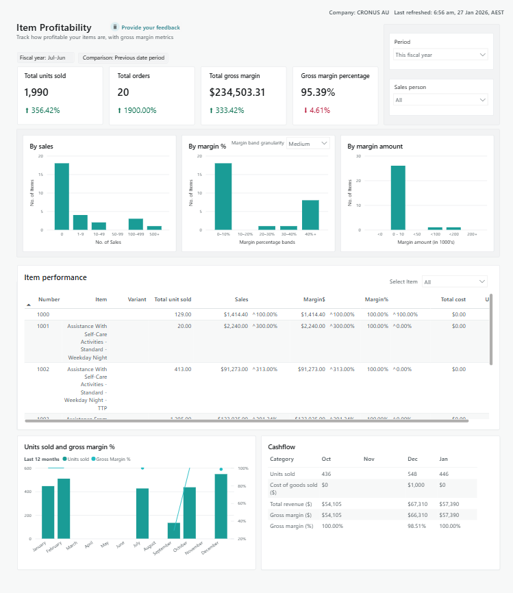 - Select the Item Profitability menu. The Item Profitability Power BI reports display.