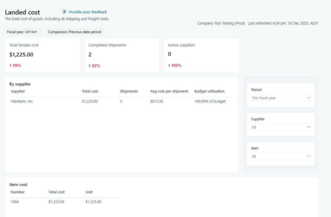 | Budget utilisation | Budgeted Cost = Direct Cost plus Budgeted Landed Cost. Utilisation % = (Actual minus Budget) divided by Budget multiplied by one hundred. |
