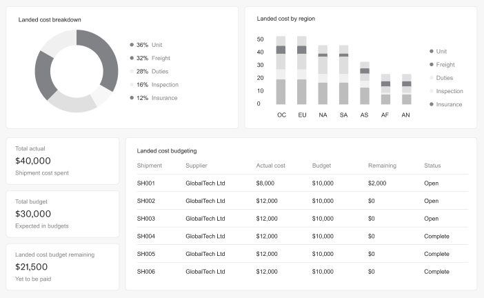 | Landed cost breakdown | Category % = Category Total divided by Total Landed Cost multiplied by one hundred. | Identify major cost drivers (freight, duties, insurance, other). |