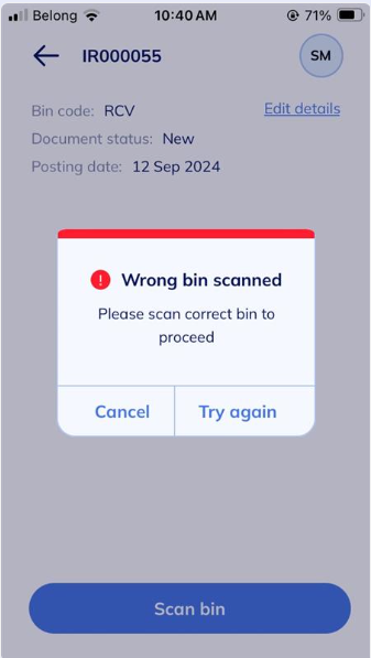 Note: The camera scan action fills in the relevant fields on the app with the correct data. This may populate a bin code number, bring up an item document or show a pick where the item is present.