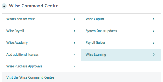 - Alternatively, you can select the Wiise Learning link from the Wiise Command Centre tile in Wiise Insights.
